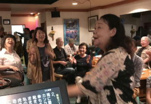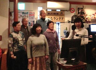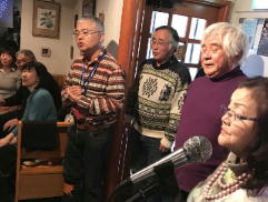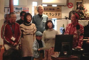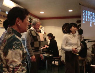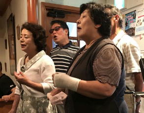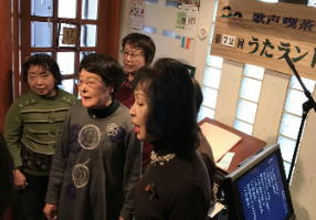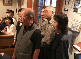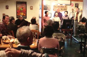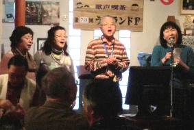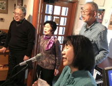 このところあちこちのうたごえ喫茶で前に出て、マイクを持って歌っている